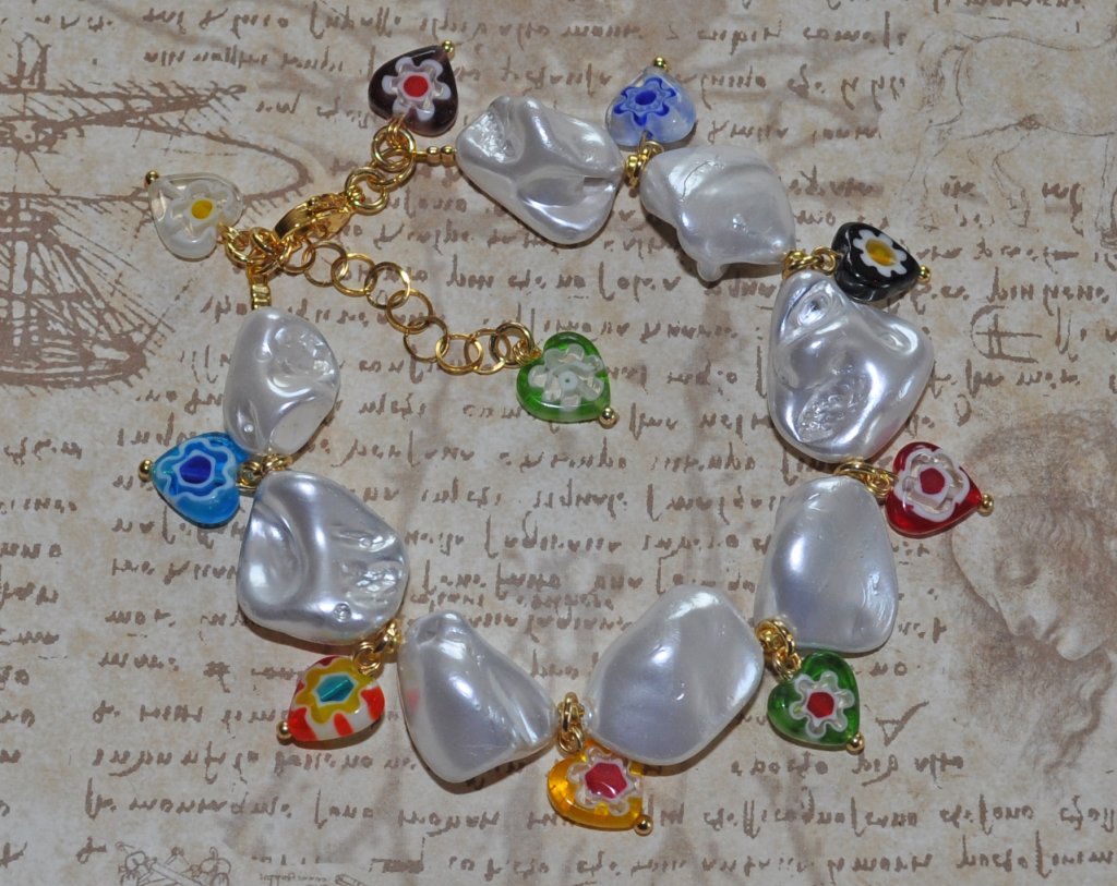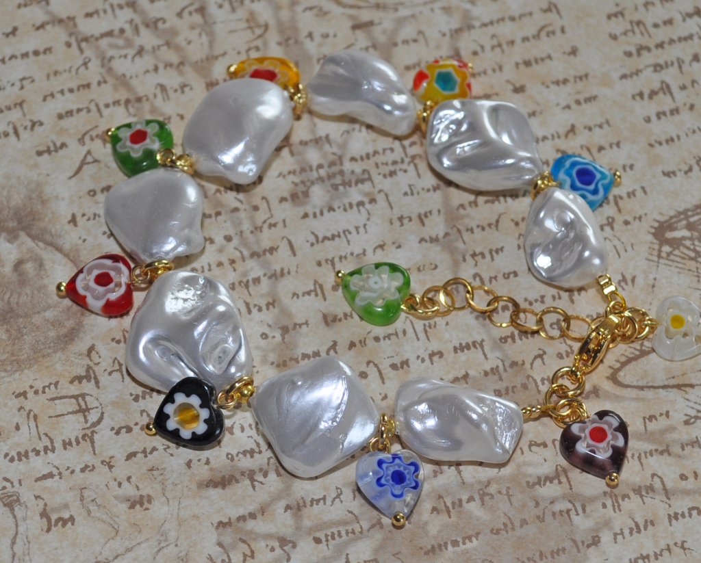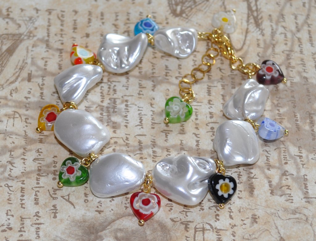 Ge din sommarstil en nostalgisk touch med detta djärva, chunky armband! Armbandet består av vita elektropläterade snäckskalsnuggets och lekfulla Millefiori-glashjärtan. Inspirerat av 90-talets charm och Y2K-estetik är det det perfekta statement-smycket som lyfter vilken outfit som helst – från strandlook till festivalstil.