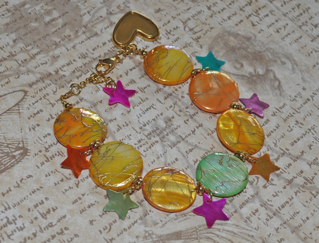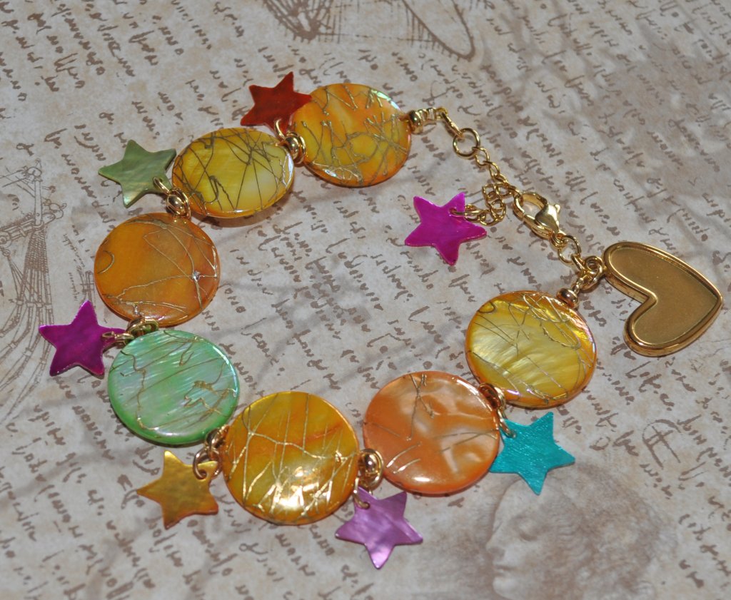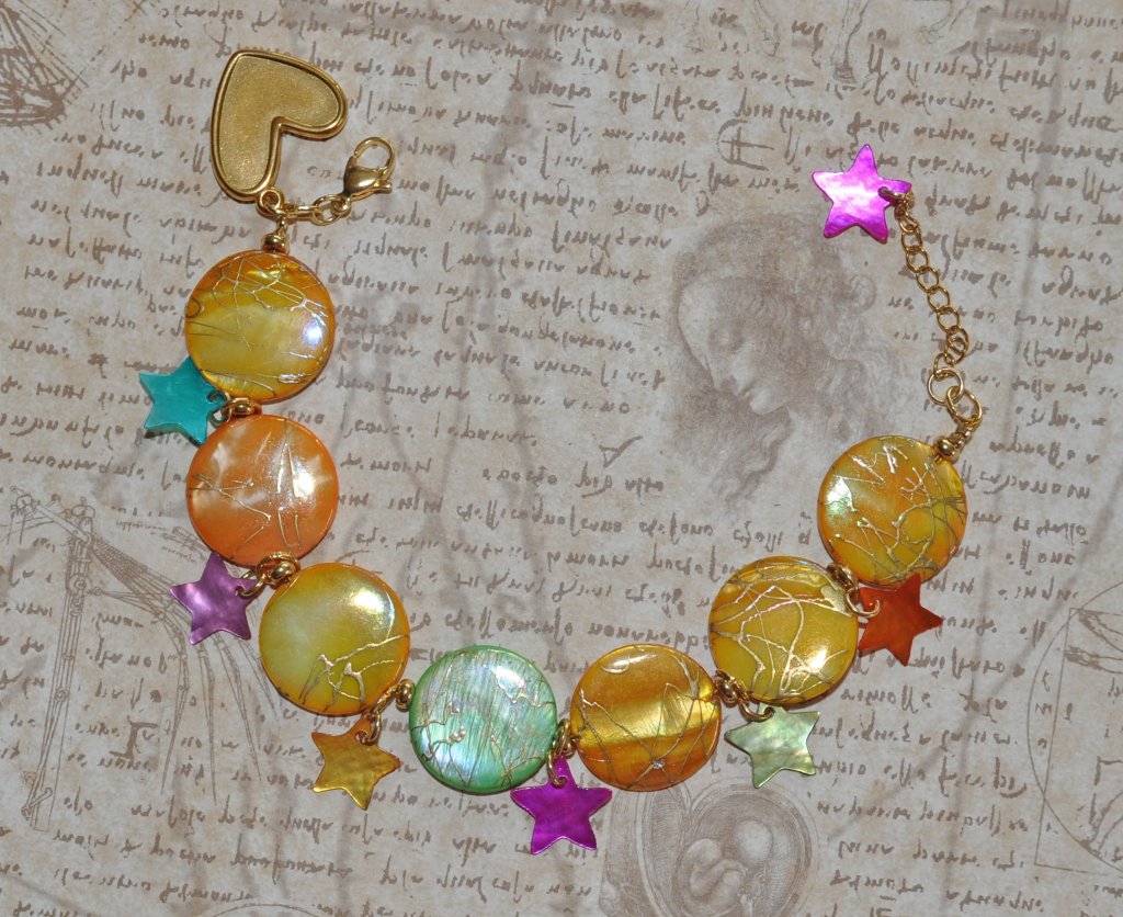 Fånga lekfullheten från tidigt 2000-tal med detta färgglada armband! Smyckat med pärlemorsmynt i solig gul, livfull orange och frisk grön, tillsammans med pärlemorsstjärnor i flera glittrande färger – en riktig färgexplosion som andas Y2K-glam och nostalgi.