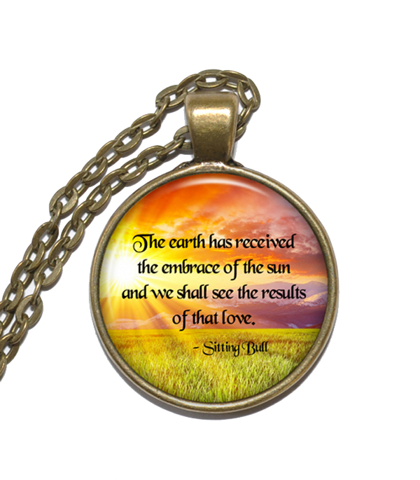 Snyggt halsband med en handgjord altered art cabochon i glas med citatet "The earth has received the embrace of the sun and we shall see the results of that love." (Sitting Bull)