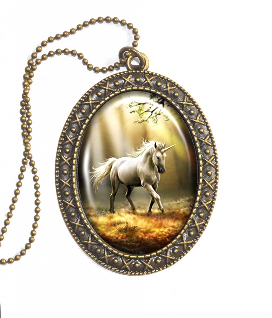 Snyggt halsband med en stor handgjord altered art cabochon i glas med en enhörning. Bronspläterad kulkedja som mäter ca 70 cm. Glascabochon ca 40x30mm.