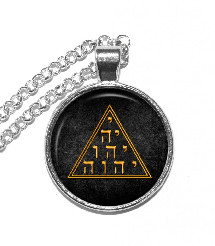 Snyggt halsband med en handgjord altered art cabochon i glas med en Tetragrammaton symbol.