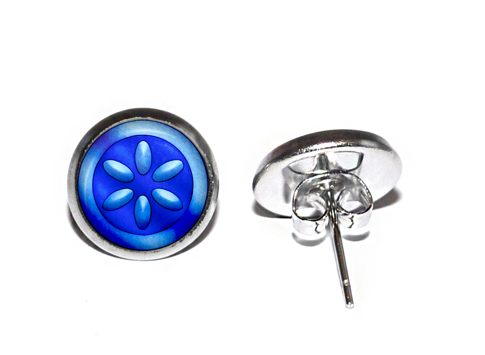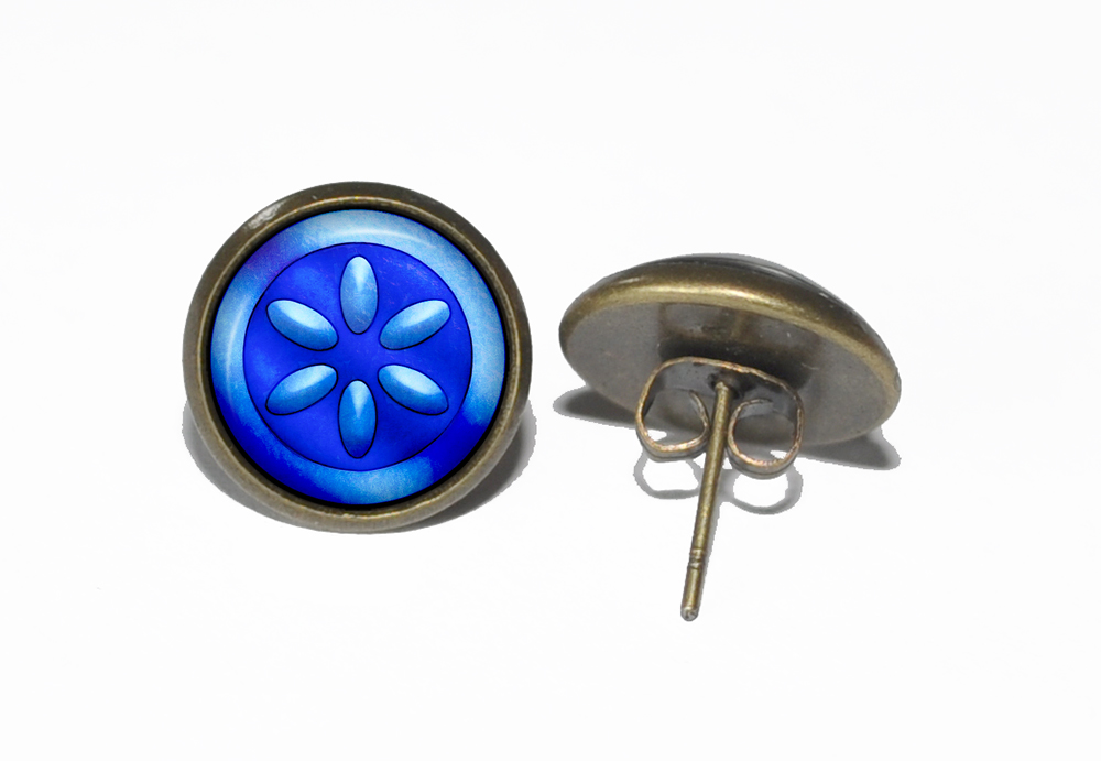 Snygga stiftörhängen med handgjorda altered art cabochoner i glas med bilder på Water Medallion från spelserien The Legend of Zelda. Välj mellan rostfritt stål (ca 12mm i diameter) eller nickel-, kadmium- och blyfri brons (ca 14mm i diameter).
