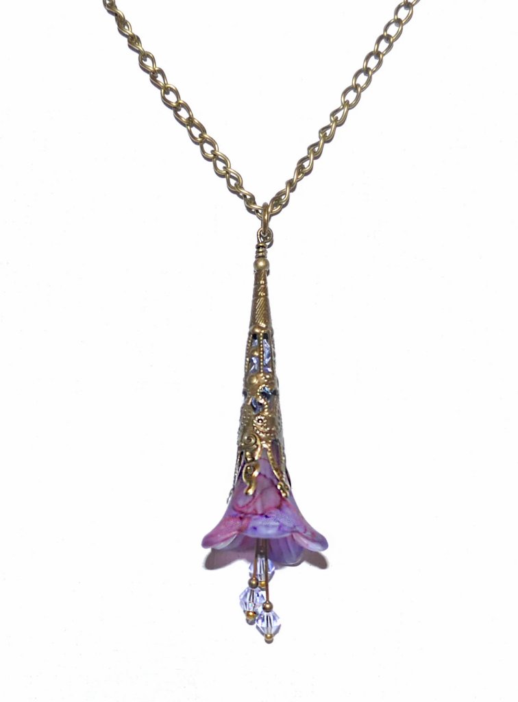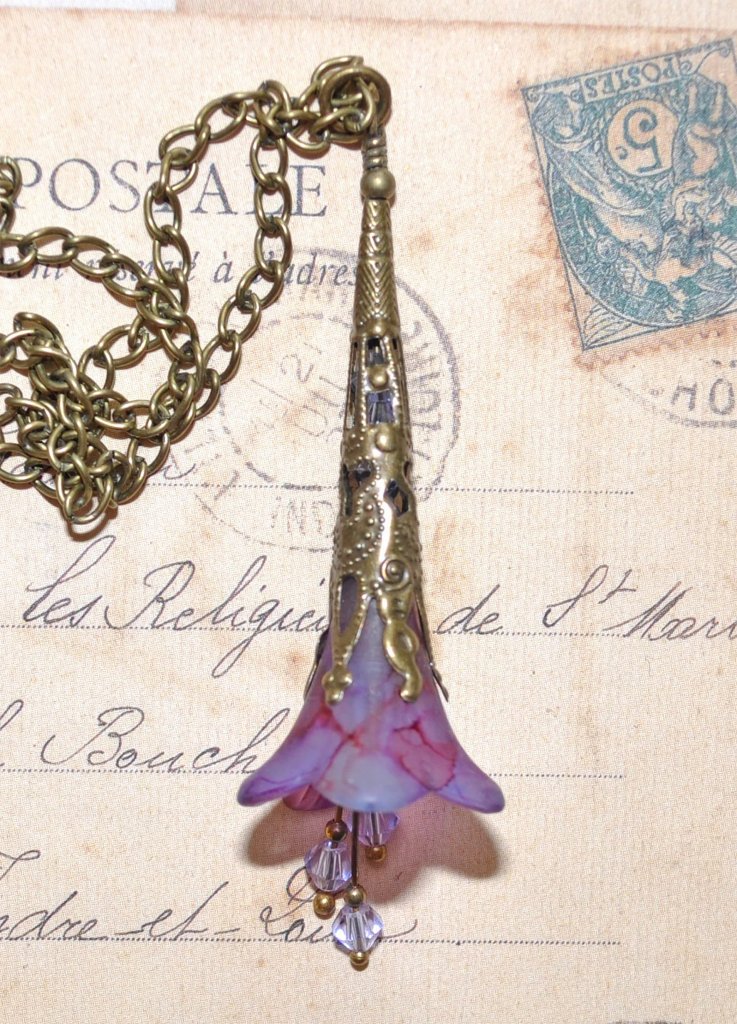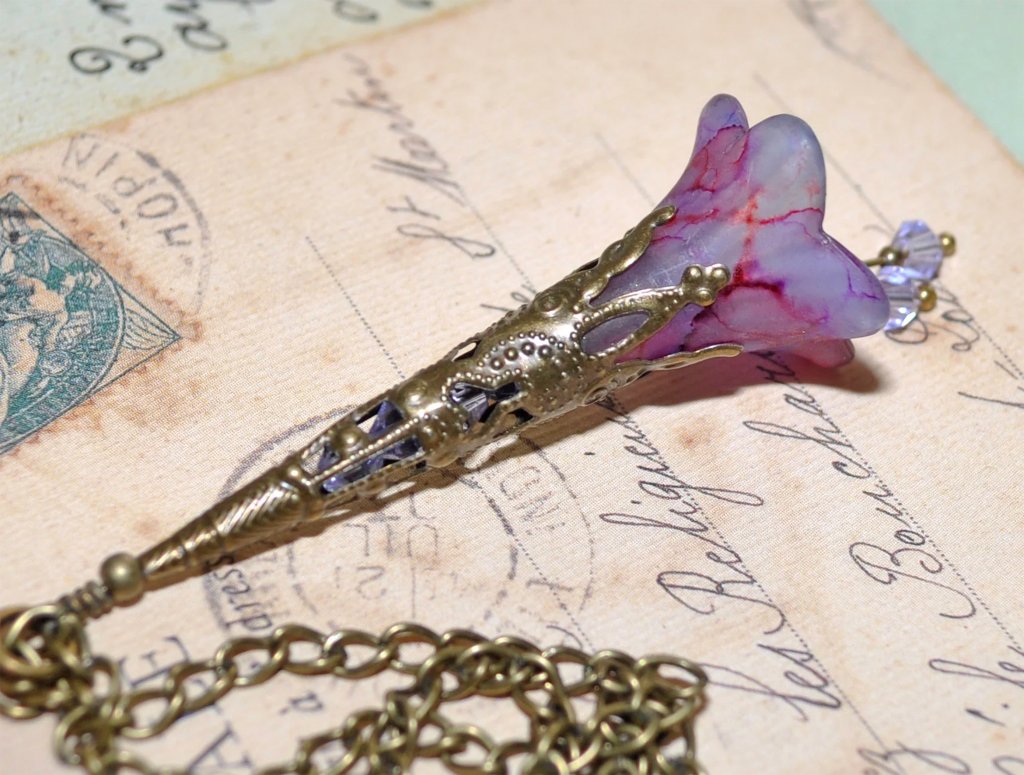 Låt dig förtrollas av detta sagolika halsband — ett handgjort konstverk med ett frostat lucite-blomhänge, vars kronblad skimrar i nyanser av fuchsia, plommon och lavendel. Inuti de antikbronsfärgade filigrankåporna glimmar ljuslila kristaller, medan de svängande ståndarna dansar och fångar ljuset vid varje rörelse.