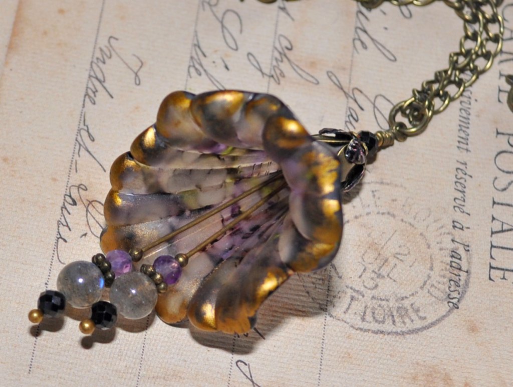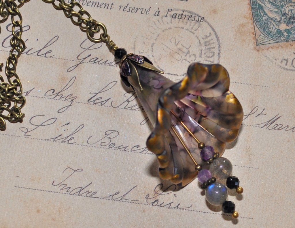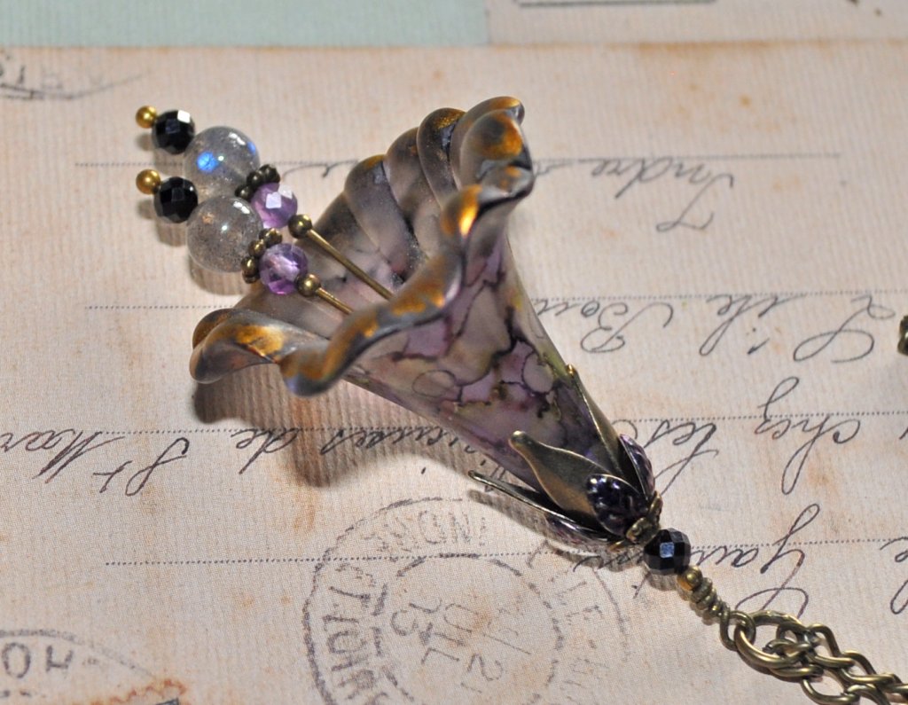 Vackert halsband med ett stort frostat lucite-blomhänge, handmålat i nyanser av aubergine, oliv, svart och guld, prytt med en facetterad svart spinellpärla och en handmålad filigrandetalj.