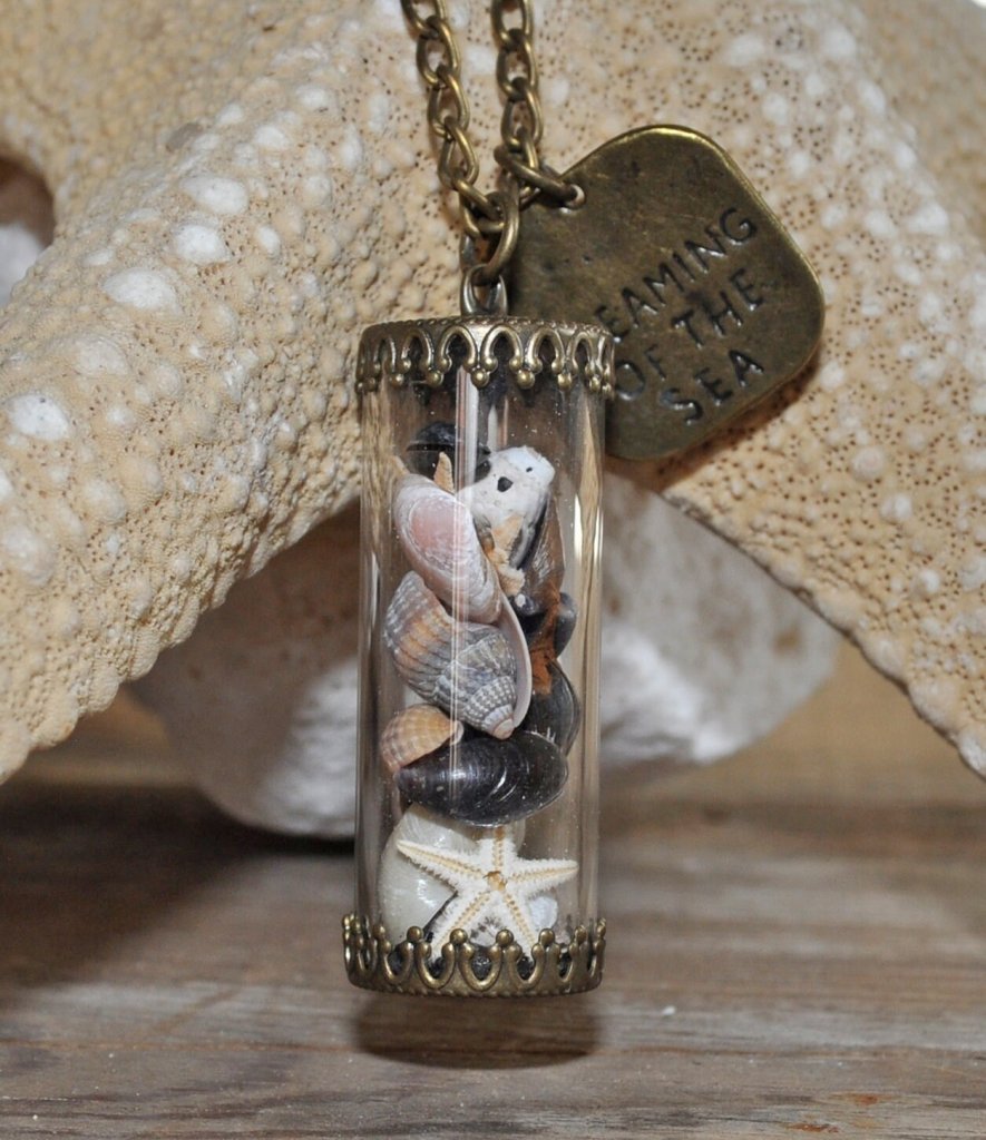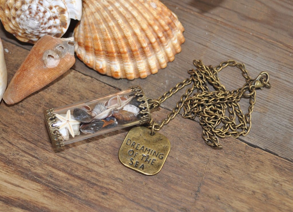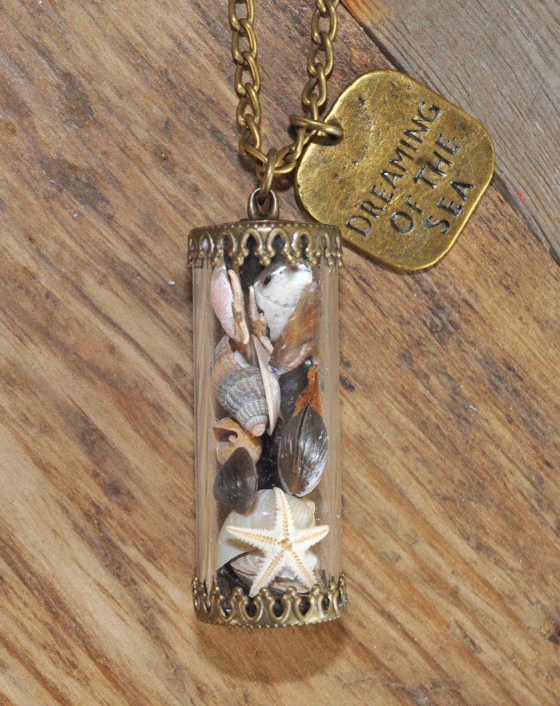 Dröm dig bort till havets magi med detta unika hänge! Små snäckor och en sjöstjärna bevarade i en glasbehållare, dekorerad med en bronspläterad berlock med texten "Dreaming of the sea".