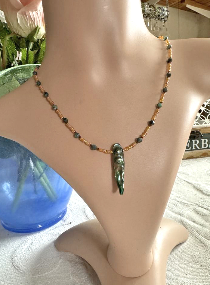 Detta handgjorda halsband kombinerar den naturliga skönheten hos facetterade äkta smaragdpärlor, skimrande glaspärlor och delikata tjeckiska Charlotte-cut-pärlor i en harmonisk, jordnära symfoni.