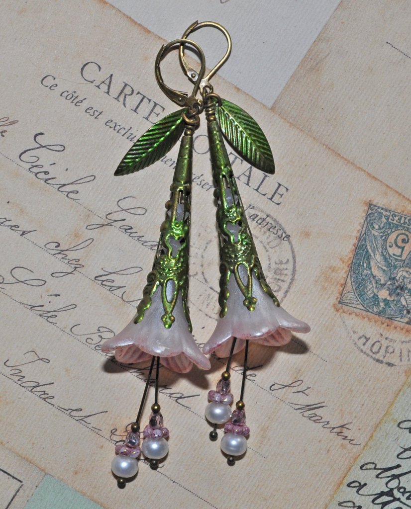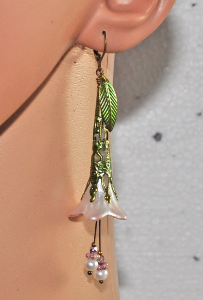 Inuti kåporna döljer sig vita opalbicones, och vita sötvattenspärlor tillsammans med tjeckiska glaspärlor dekorerar de svängande ståndarna som rör sig mjukt med minsta rörelse.