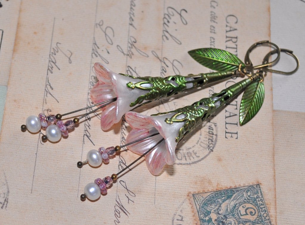 Dessa vackert detaljerade örhängen pryds av handmålade luciteblommor i skimrande pärlemor och mjukt rosa, toppade med handmålade antique bronze-filigrankåpor.