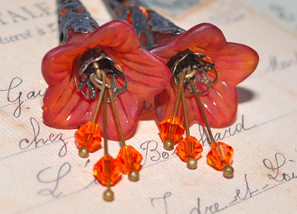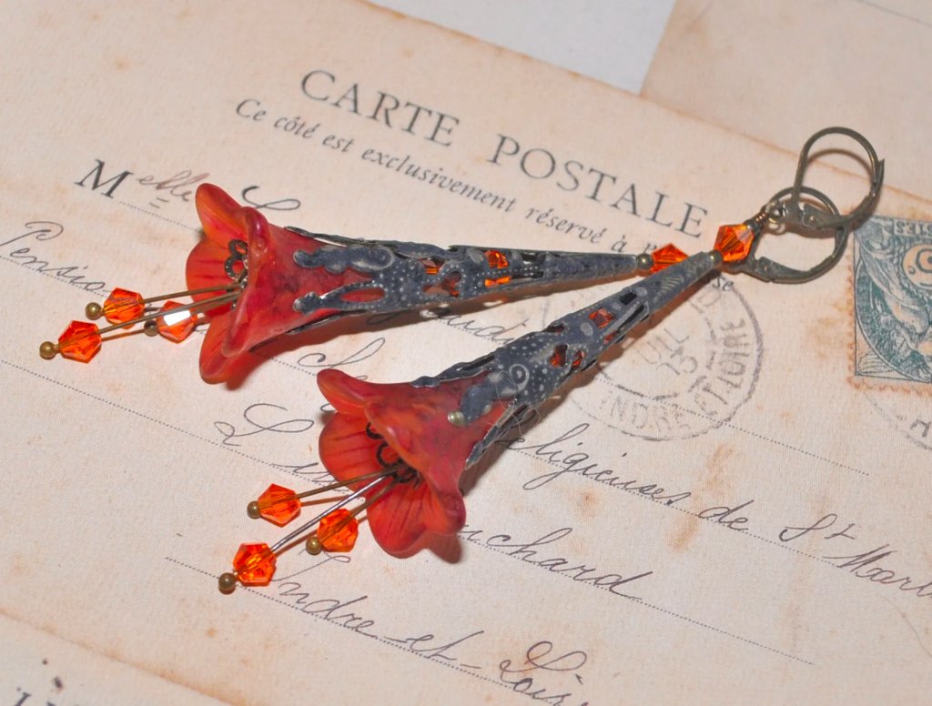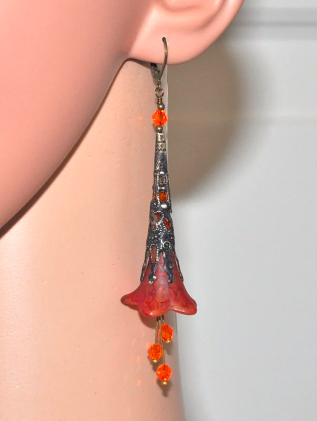 Vackert detaljerade örhängen på bronspläterade nickel- och blyfria brisyrkrokar med handmålade blommor i akryl, bronsfärgade mellandelar, facetterade Orange kristaller samt facetterade gnistrande Orange kristaller inuti handemaljerade och slipade filigrankoner.