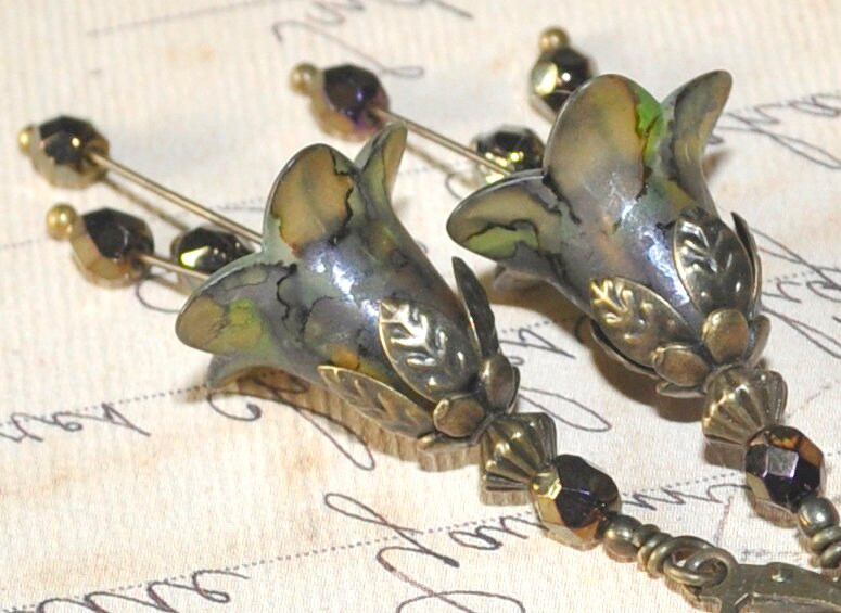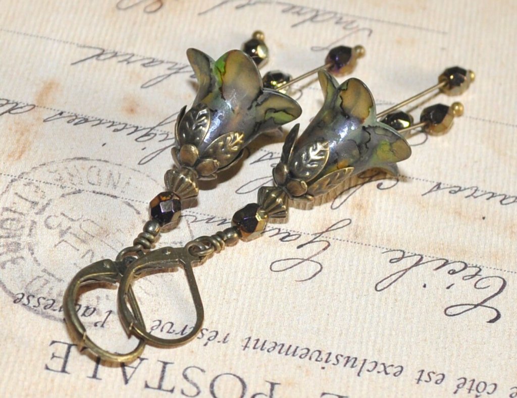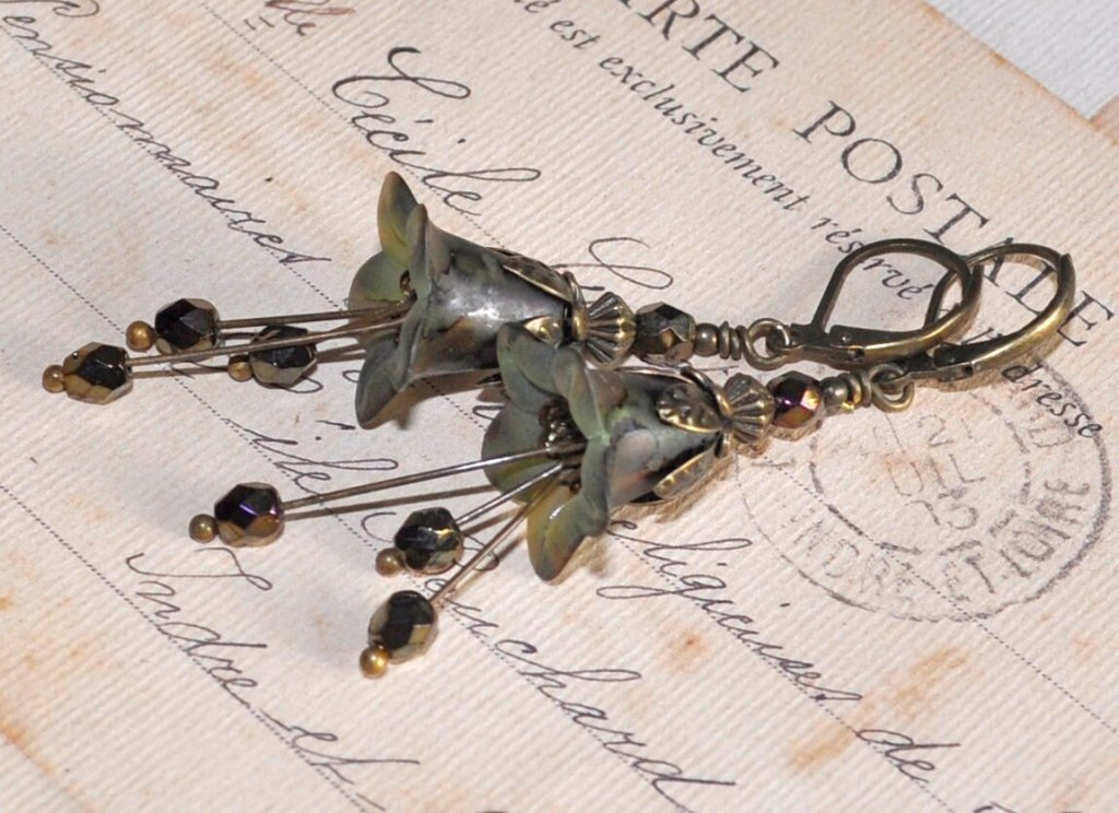 Bronsfärgade pärlor i tjeckiskt glas dekorerar också de bronsfärgade dinglande ståndarhängena som svajar och svänger vid minsta rörelse.