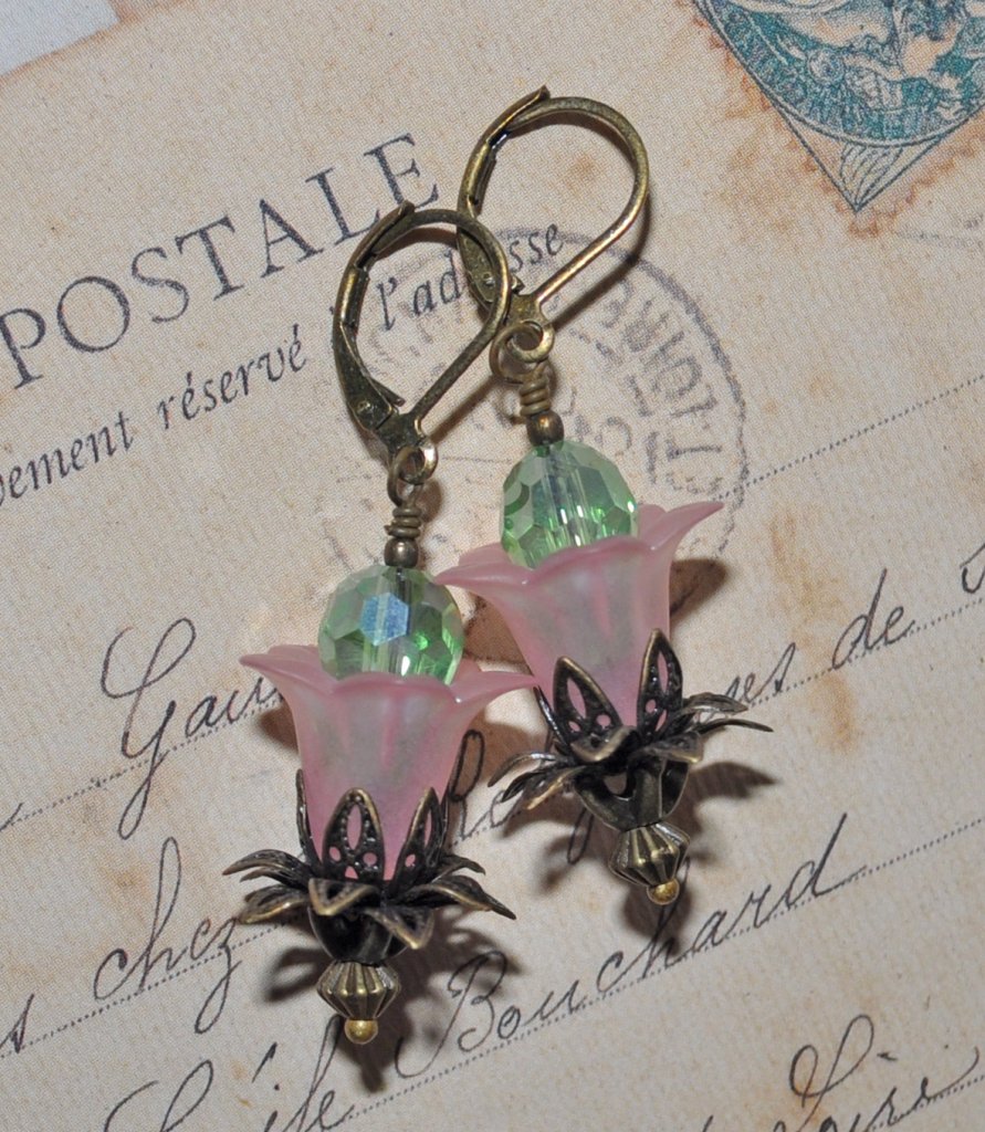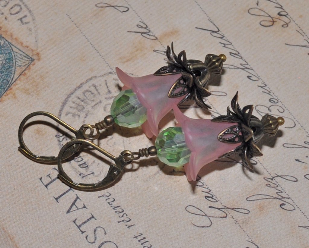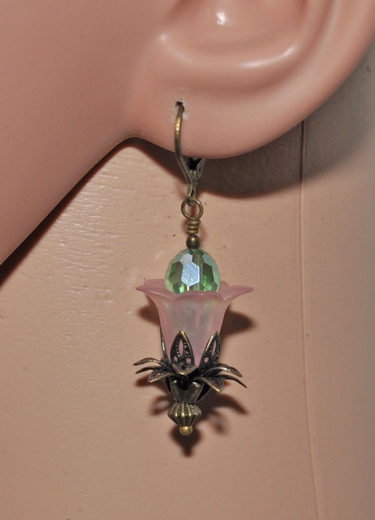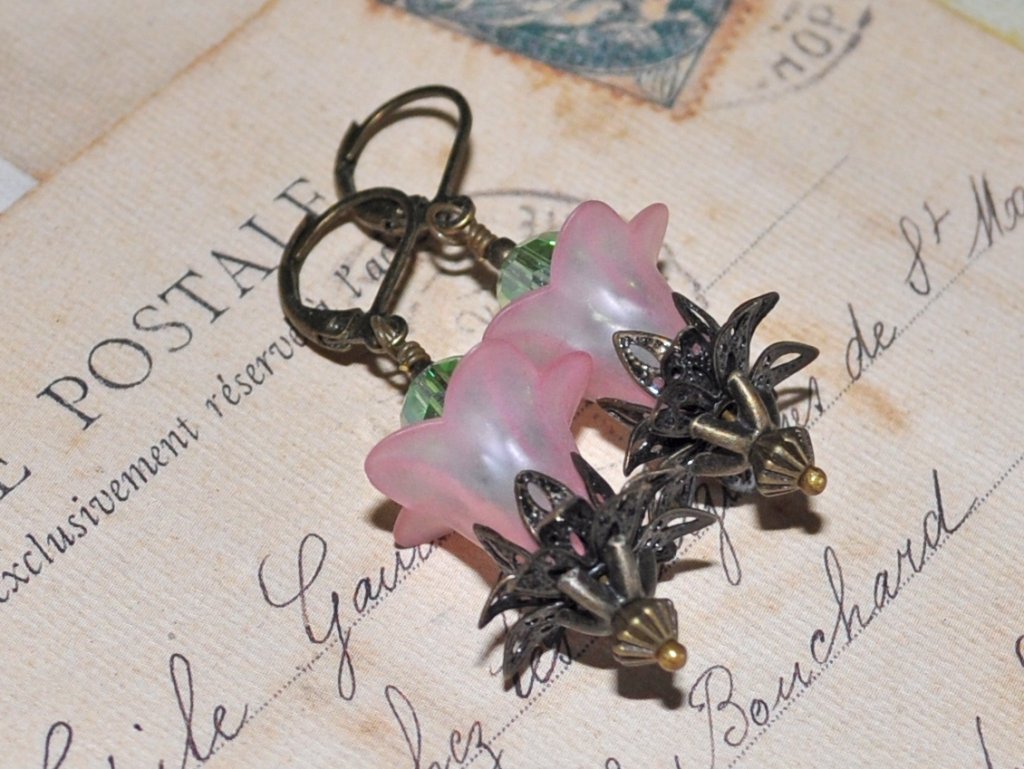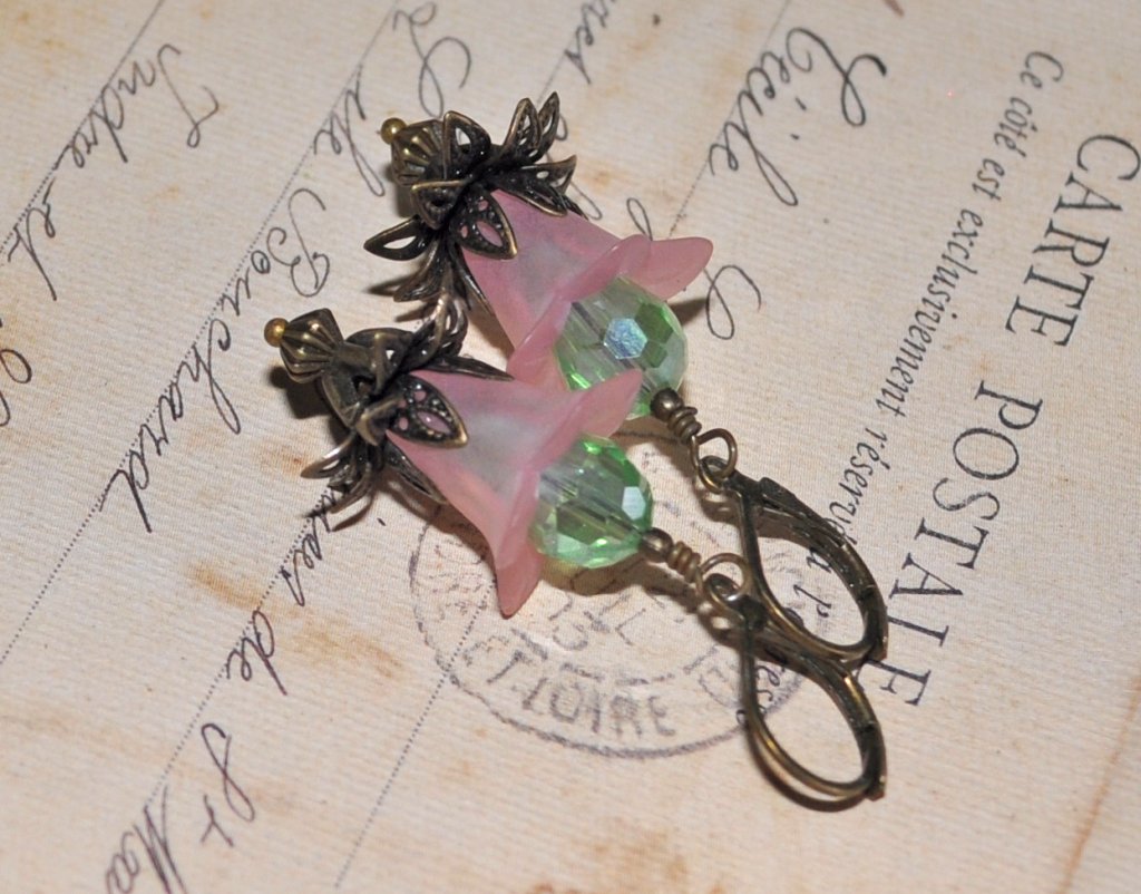Vackert detaljerade örhängen på bronspläterade nickel- och blyfria brisyrkrokar med frostade rosa blommor i akryl, bronsfärgade mellandelar samt facetterade Peridot AB kristalldroppar.