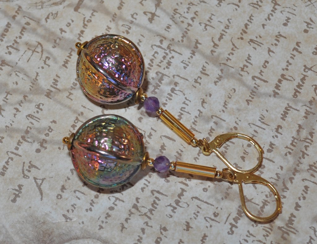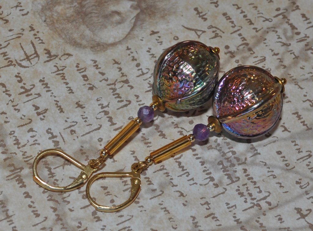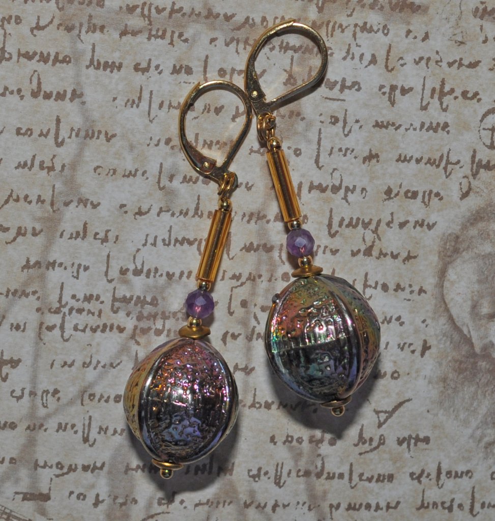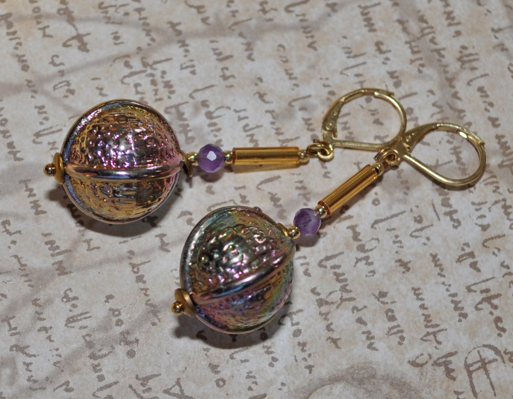Varje örhänge pryds av fasetterade ametistpärlor, guldfärgade glasbuglepärlor och mässingsdetaljer, vilket skapar en fängslande balans mellan glans och struktur. De 18K guldpläterade brisyrkrokarna i kirurgiskt rostfritt stål erbjuder både komfort och hållbarhet.