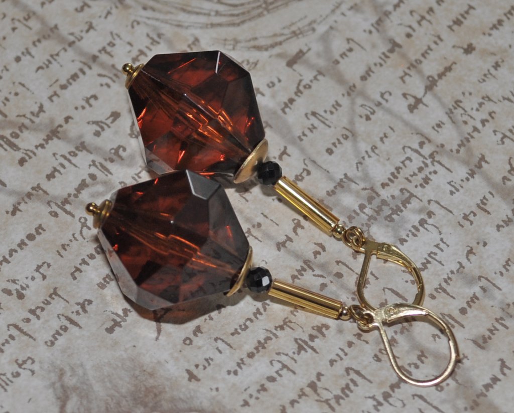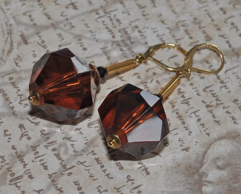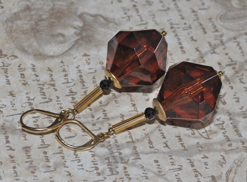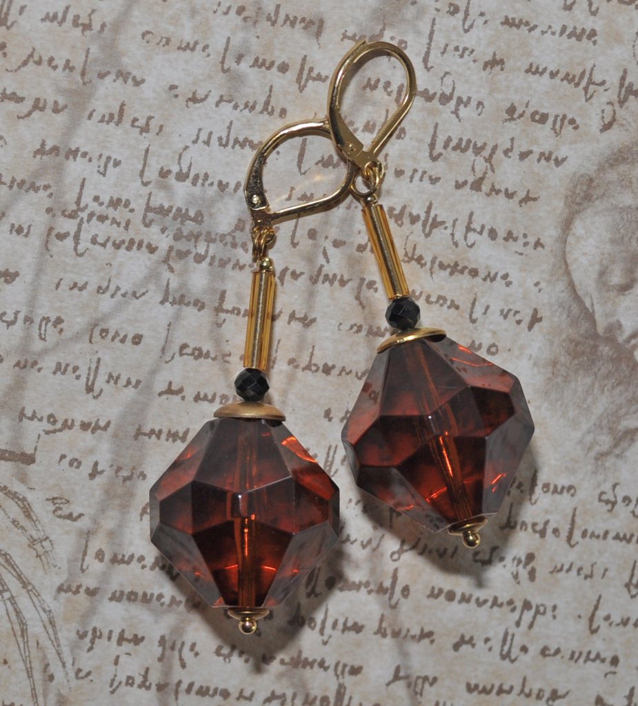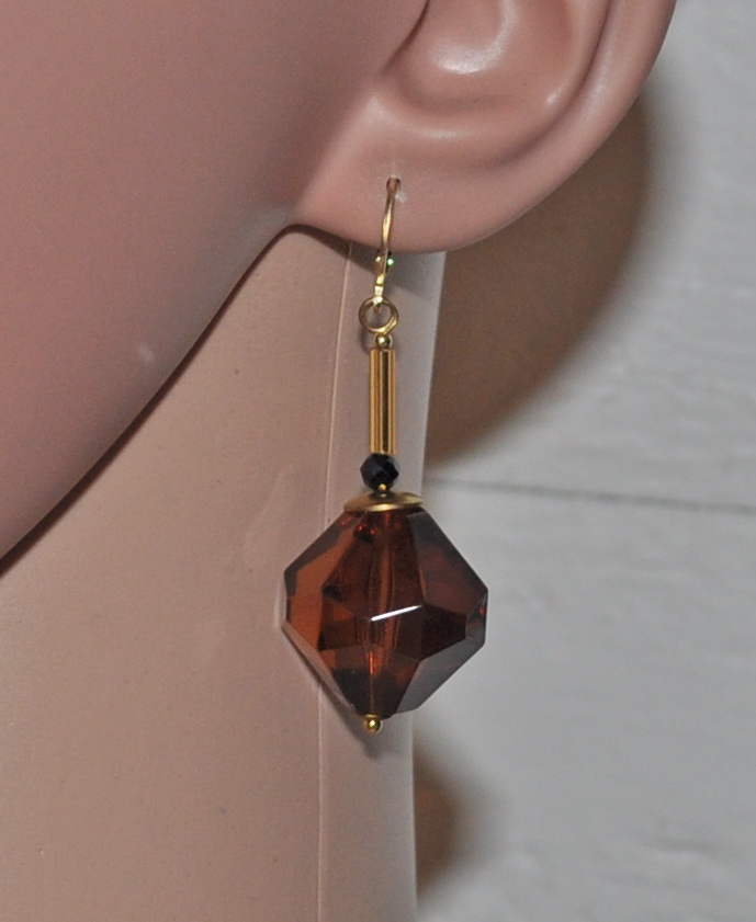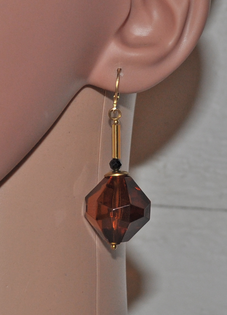 Kliv rakt in i 60-talets elegans med dessa exklusiva statement-örhängen, prydda med stora mörkt kastanjebruna akryl-biconepärlor (21 mm) i mint condition från 1960-talet. De autentiska vintagepärlorna kombineras med gnistrande facetterade svarta spineller och gyllene glaspärlor som fångar ljuset med subtil glamour.