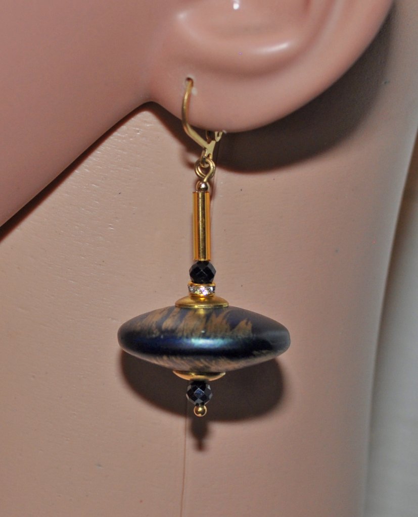 Designen förstärks med facetterade svarta spinellpärlor, gnistrande strassrondeller och gyllene glaspärlor som skapar en lager-på-lager-look av retroglamour och tidlös sofistikation. Varma mässingsdetaljer harmonierar vackert med färgpaletten, medan örkrokar i 18K guldpläterat rostfritt stål ger både komfort och hållbarhet.