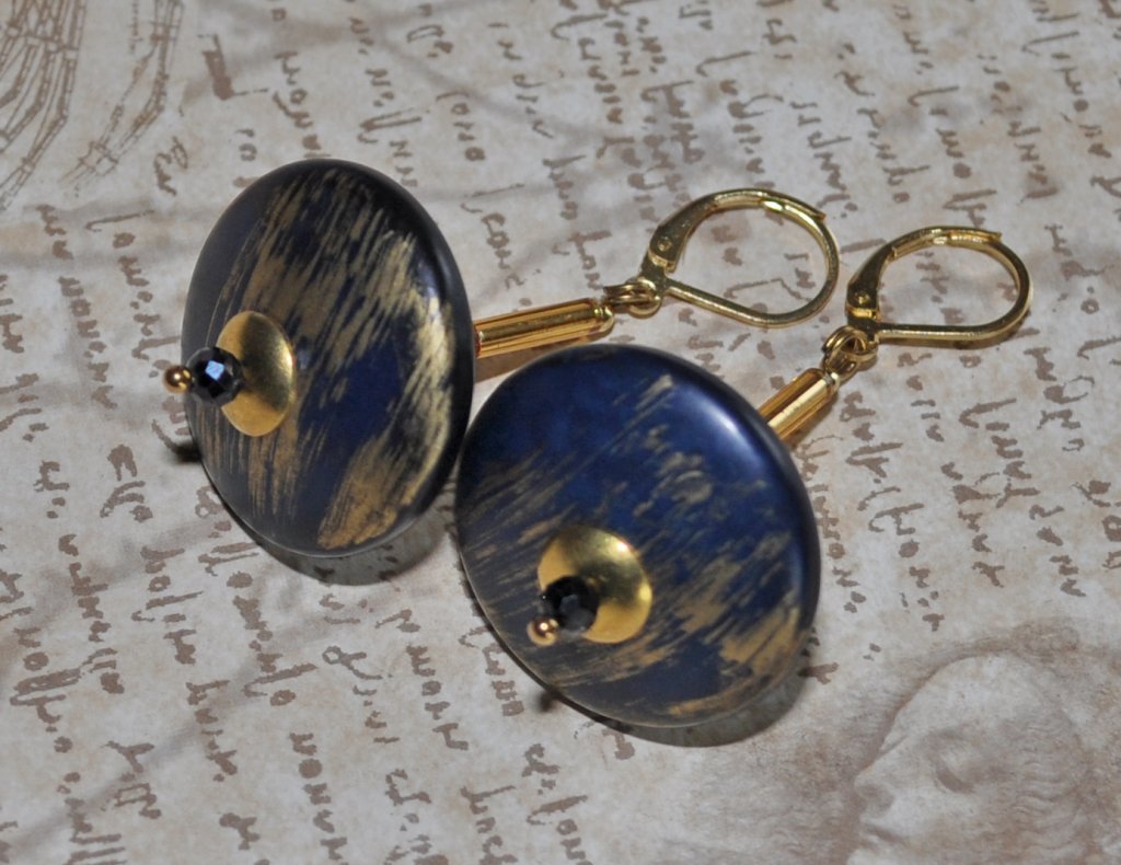 Kliv in i 60-talets djärva elegans med dessa vintage-inspirerade statementörhängen. Stora marinblå akrylrondeller (26x8mm) från 60-talet i mint condition ger en glamourös lyster och äkta mid-century-känsla.