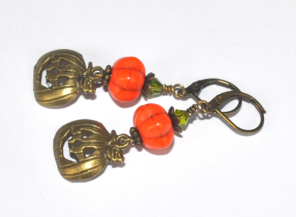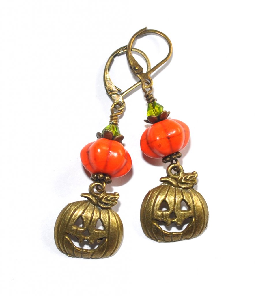 Fräcka örhängen med pumpaformade pärlor i orange howlit (infärgad), facetterade olivgröna kristaller samt bronspläterade mellandelar och pumpahängen. Nickel- och blyfria brisyrkrokar. Mäter ca 38mm från nedre delen av kroken.