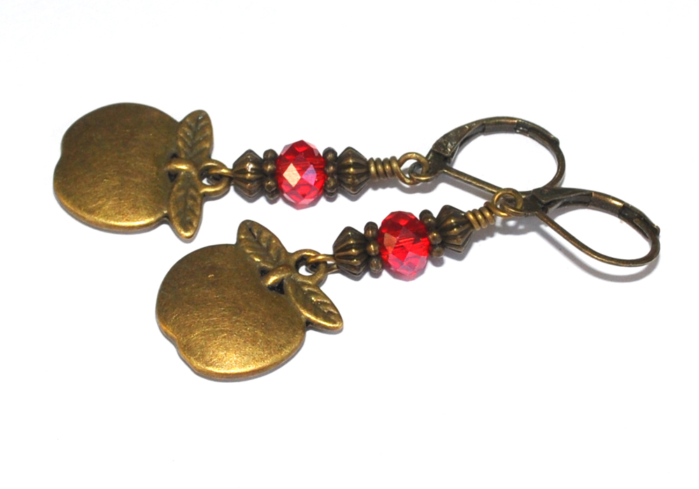 Snygga örhängen med röda facetterade kristaller och bronsfärgade äpplen. Nickel- och blyfria, bronspläterade brisyrkrokar i mässing. Mäter ca 35mm från nedre delen på kroken.